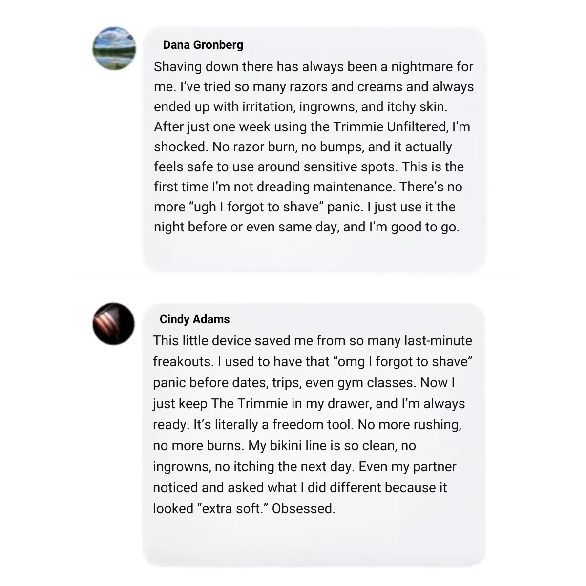 Our precision blades are crafted for your most sensitive curves — no tugging, no nicks, just a flawless glide. From trimming the top to fine-tuning the folds, The Trimmie Unfiltered delivers salon-smooth results, right at home.